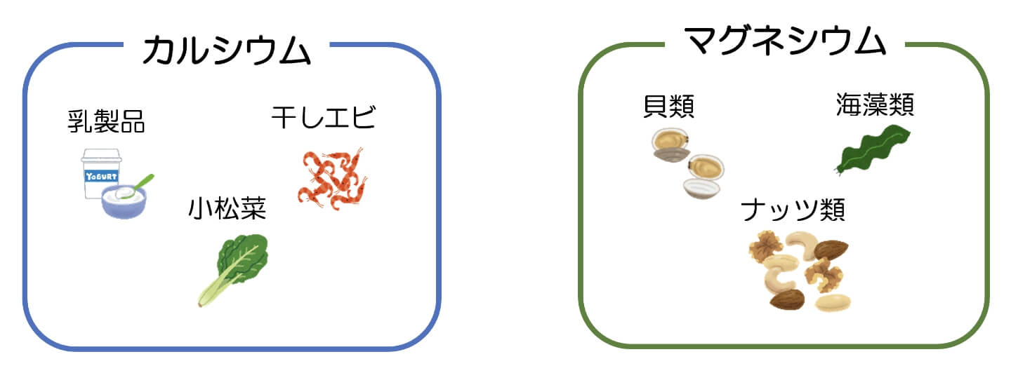 筋肉が縮むときは、カルシウム、緩むときは、マグネシウムが必要です。カルシウムやマグネシウムが不足すると、筋肉の収縮がうまくいかず、肉離れなどの筋損傷へつながります。ストレッチをするとともにしっかりとカルシウムとマグネシウムを補いましょう!